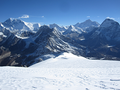A group approaching the summit of Mera Peak. Everest, Lhotse and Nuptse beyond.